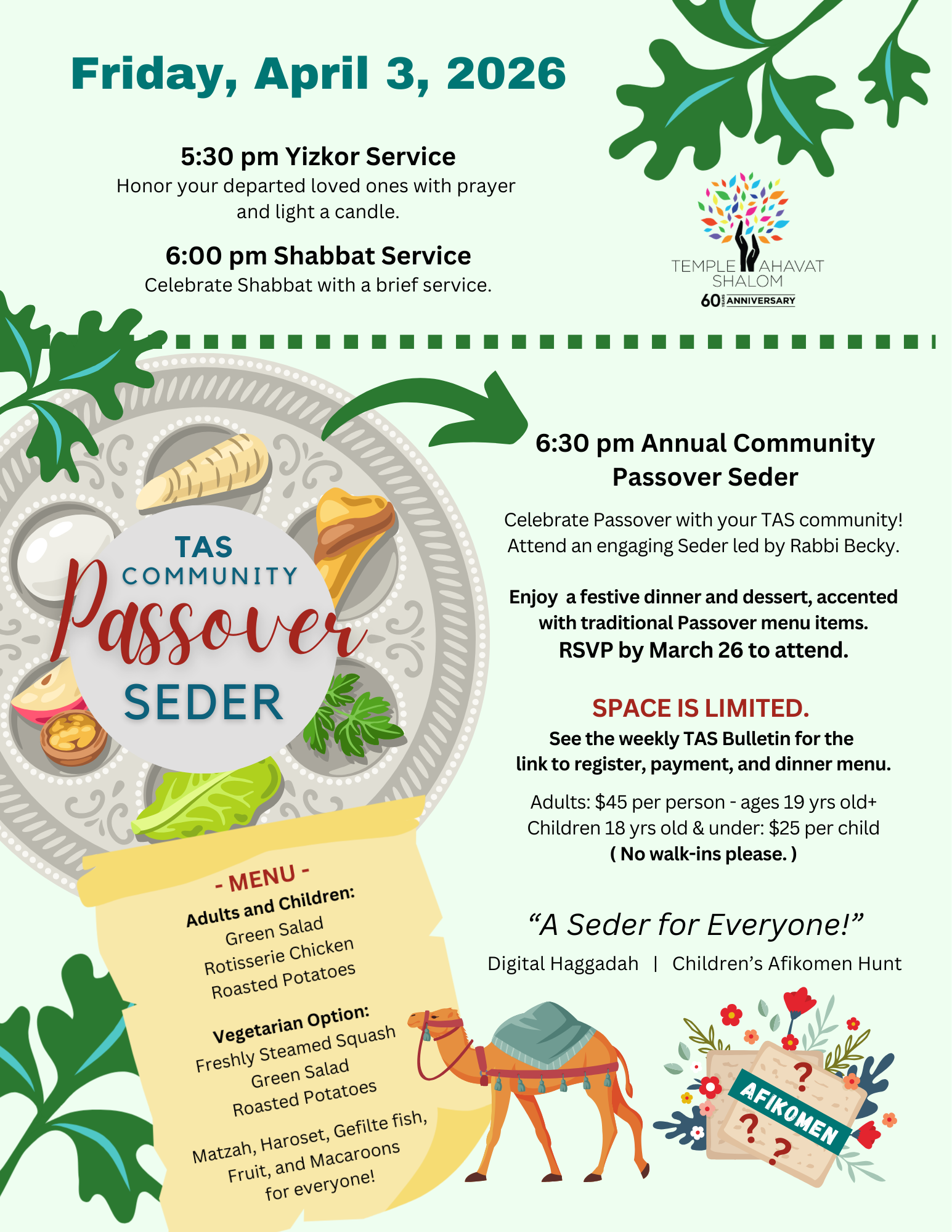 Whether it’s joining us for a Friday night Bim Bam Shabbat, a Men of TAS poker tournament, or coming by for any one of our adult education classes, Temple Ahavat Shalom is a place for you and your family to feel connected to a loving and supportive community. We will walk through life with you, celebrating simchas and providing soothing assurance that you are never alone.